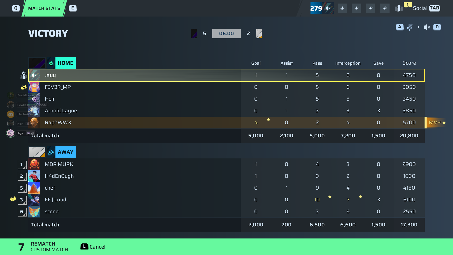 | Player | Goals | Assists | Passes | Interceptions | Saves | Score | Clean Sheet |