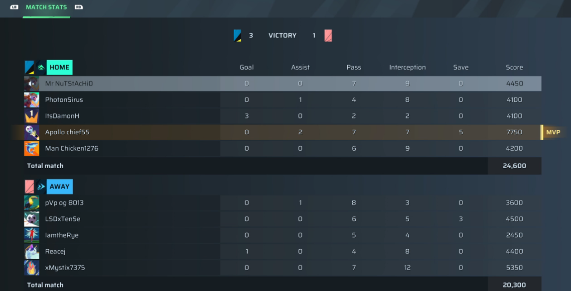 | Player | Goals | Assists | Passes | Interceptions | Saves | Score | Clean Sheet |