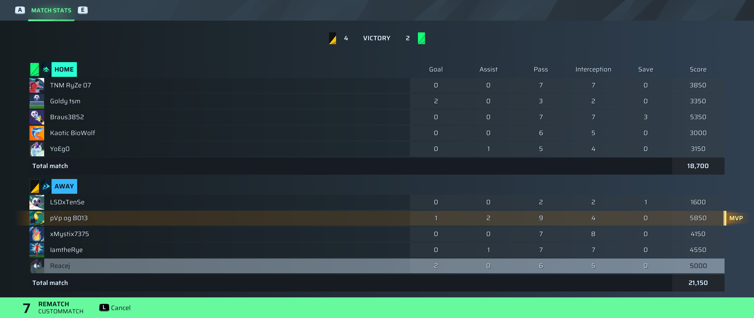 TEC I Reacej🐐#94 Striker95 OVR | 2 | 0 | 6 | 5 | 0 | 5,000 | — |
