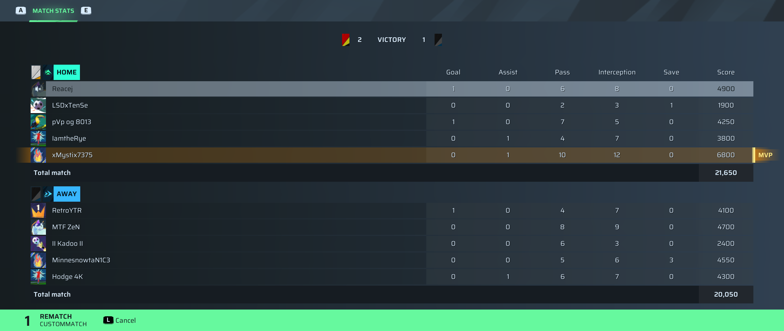 | Player | Goals | Assists | Passes | Interceptions | Saves | Score | Clean Sheet |