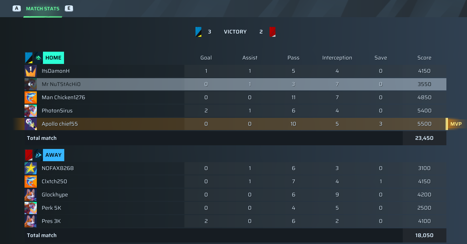 | Player | Goals | Assists | Passes | Interceptions | Saves | Score | Clean Sheet |