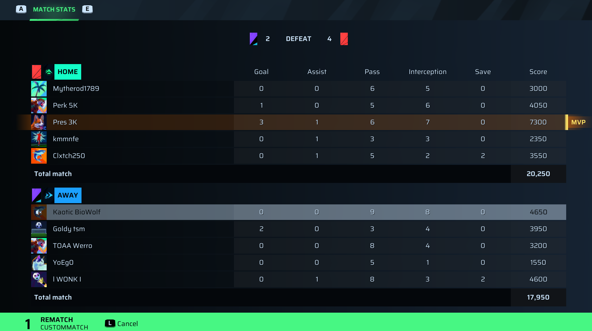 | Player | Goals | Assists | Passes | Interceptions | Saves | Score | Clean Sheet |