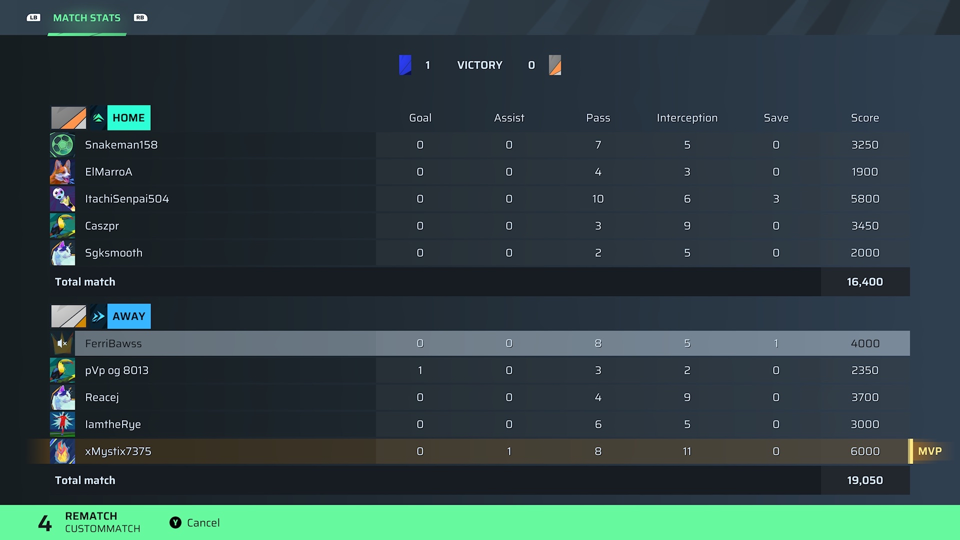 | Player | Goals | Assists | Passes | Interceptions | Saves | Score | Clean Sheet |