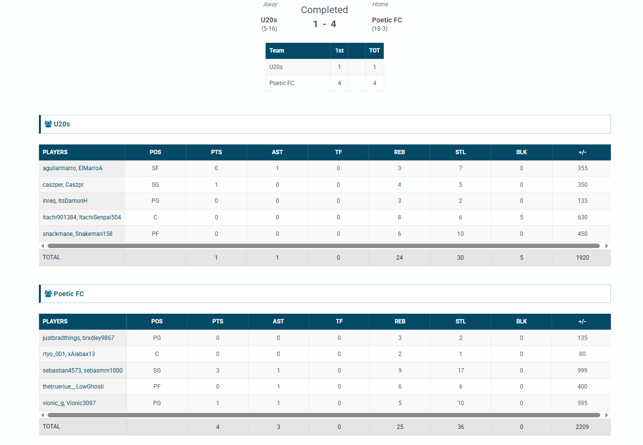 | Player | Goals | Assists | Passes | Interceptions | Saves | Score | Clean Sheet |