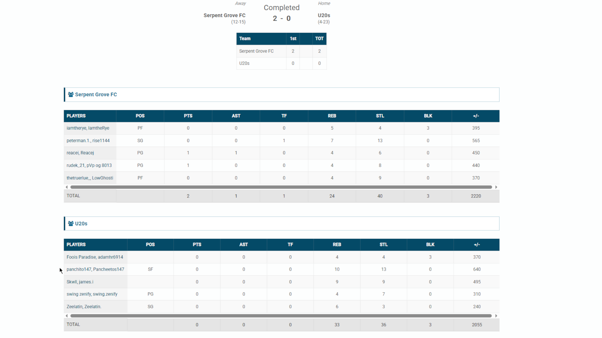 | Player | Goals | Assists | Passes | Interceptions | Saves | Score | Clean Sheet |