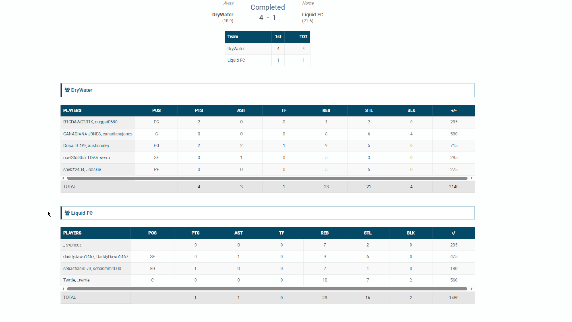 | Player | Goals | Assists | Passes | Interceptions | Saves | Score | Clean Sheet |