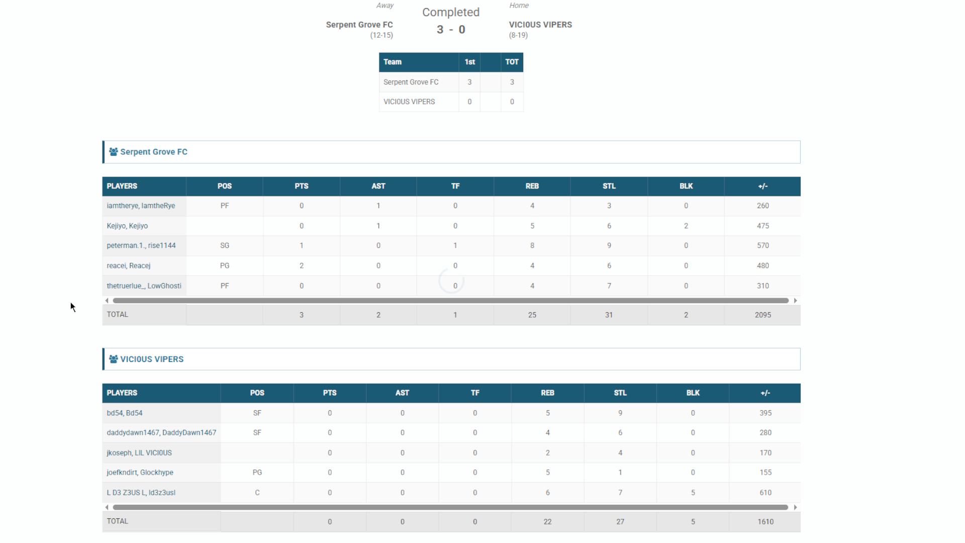 | Player | Goals | Assists | Passes | Interceptions | Saves | Score | Clean Sheet |