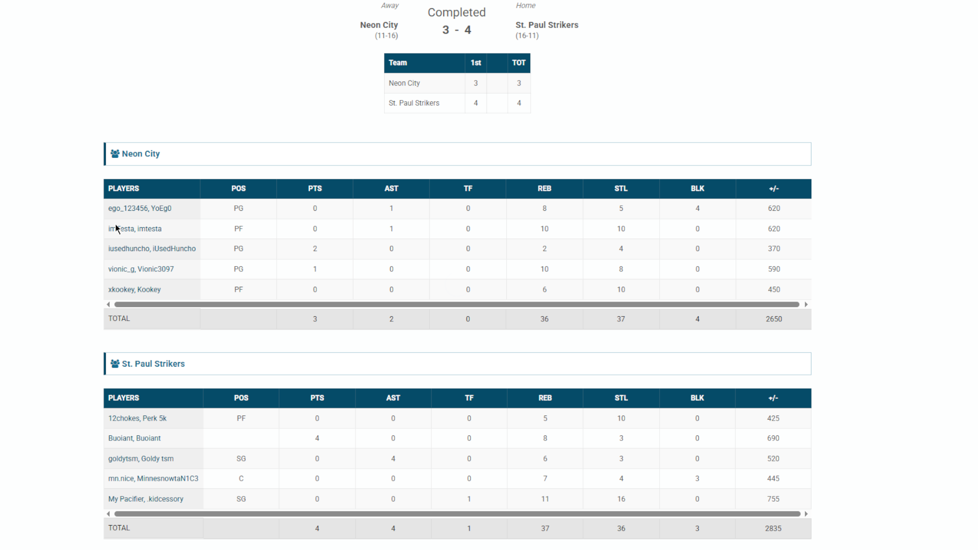 | Player | Goals | Assists | Passes | Interceptions | Saves | Score | Clean Sheet |