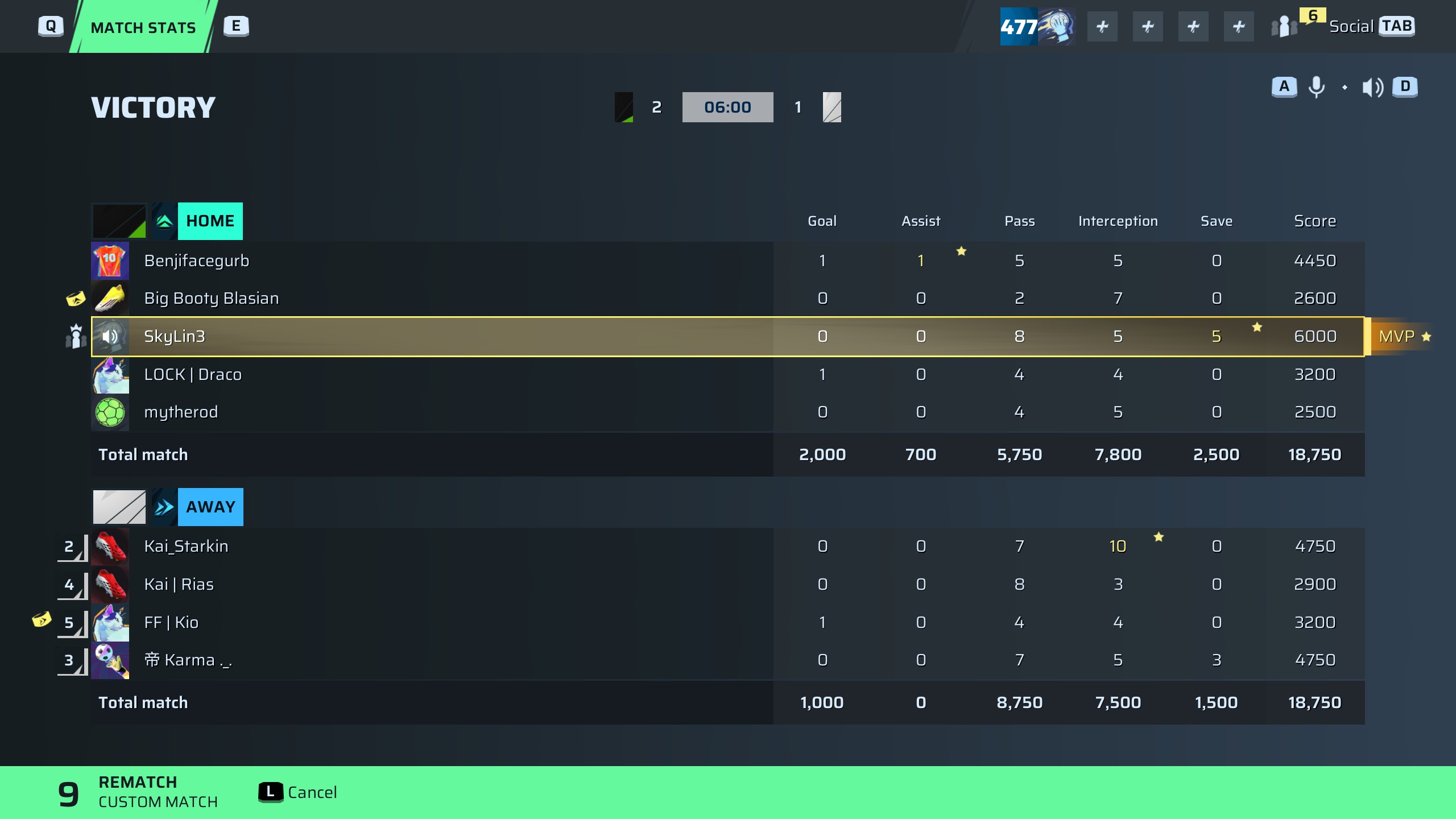 | Player | Goals | Assists | Passes | Interceptions | Saves | Score | Clean Sheet |