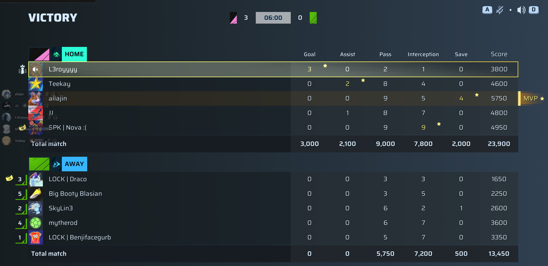 | Player | Goals | Assists | Passes | Interceptions | Saves | Score | Clean Sheet |