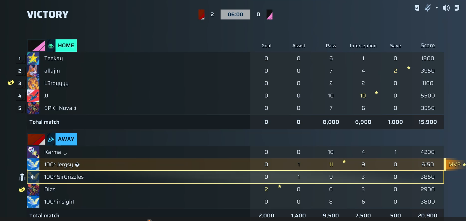 | Player | Goals | Assists | Passes | Interceptions | Saves | Score | Clean Sheet |