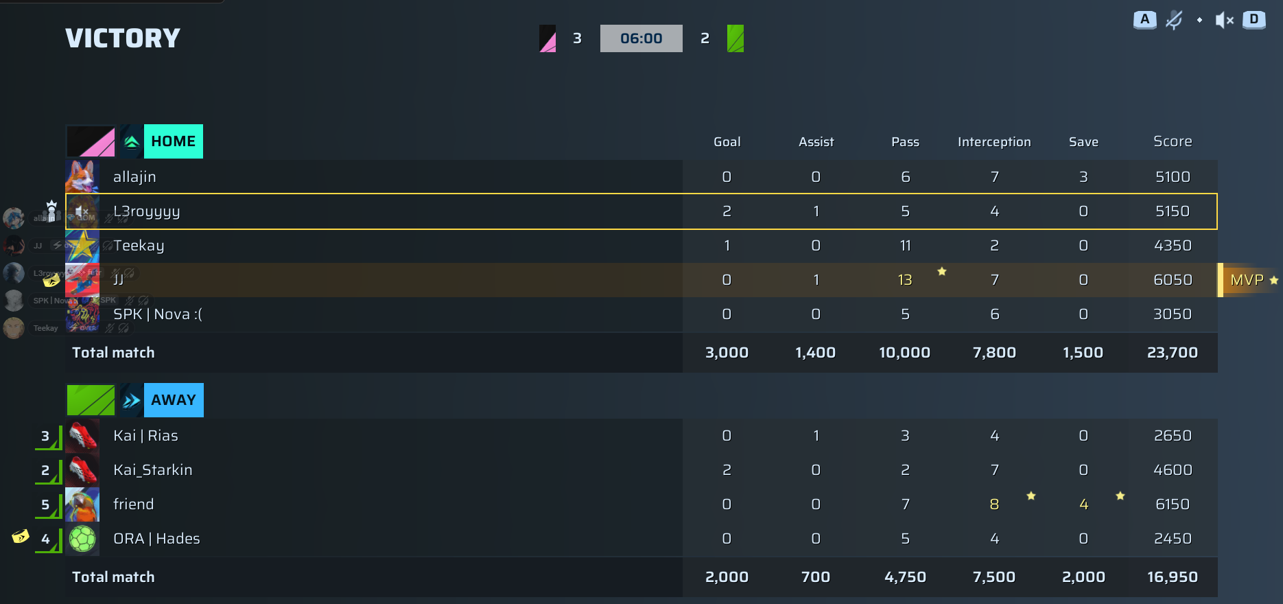 | Player | Goals | Assists | Passes | Interceptions | Saves | Score | Clean Sheet |