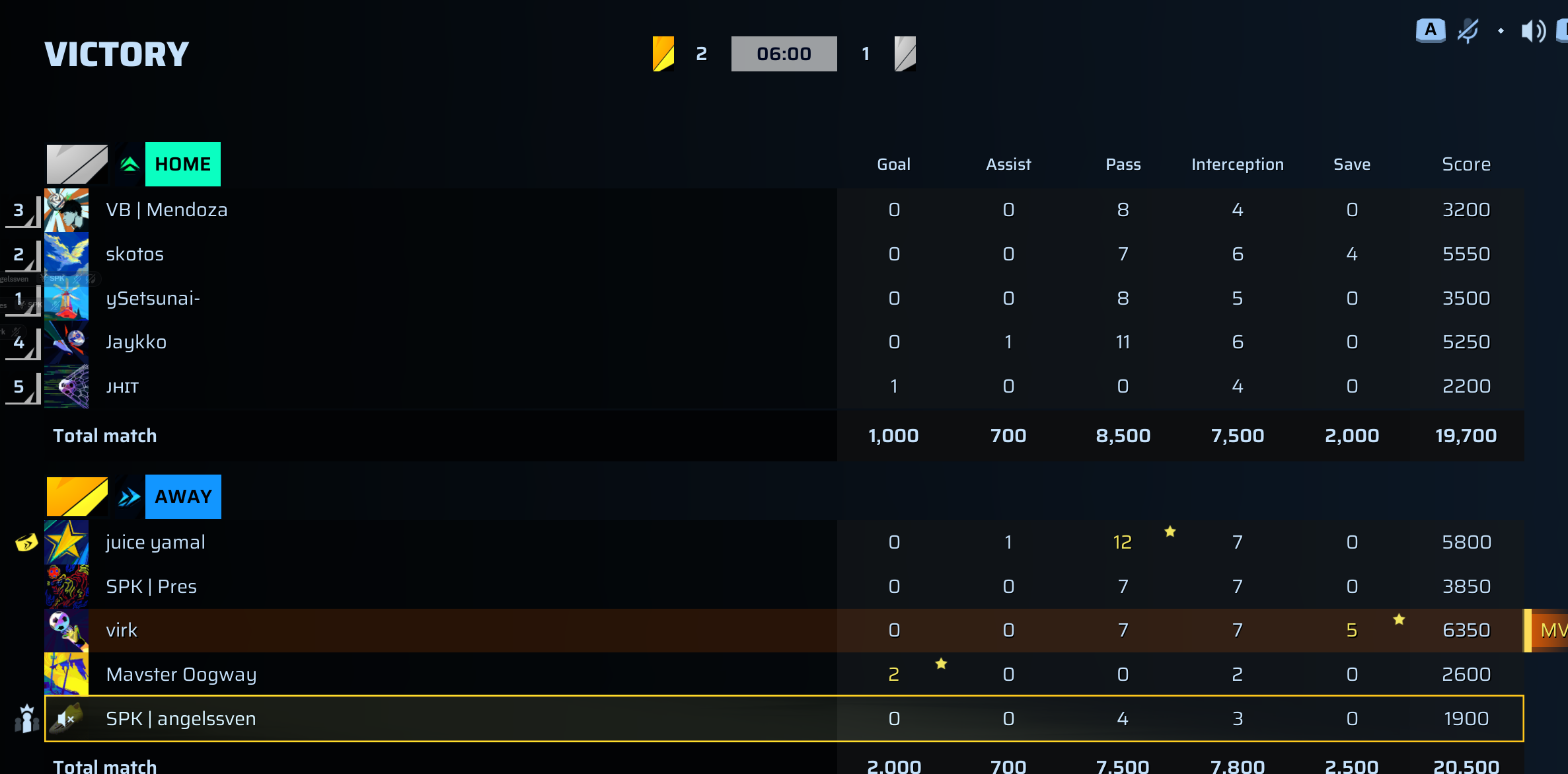 | Player | Goals | Assists | Passes | Interceptions | Saves | Score | Clean Sheet |