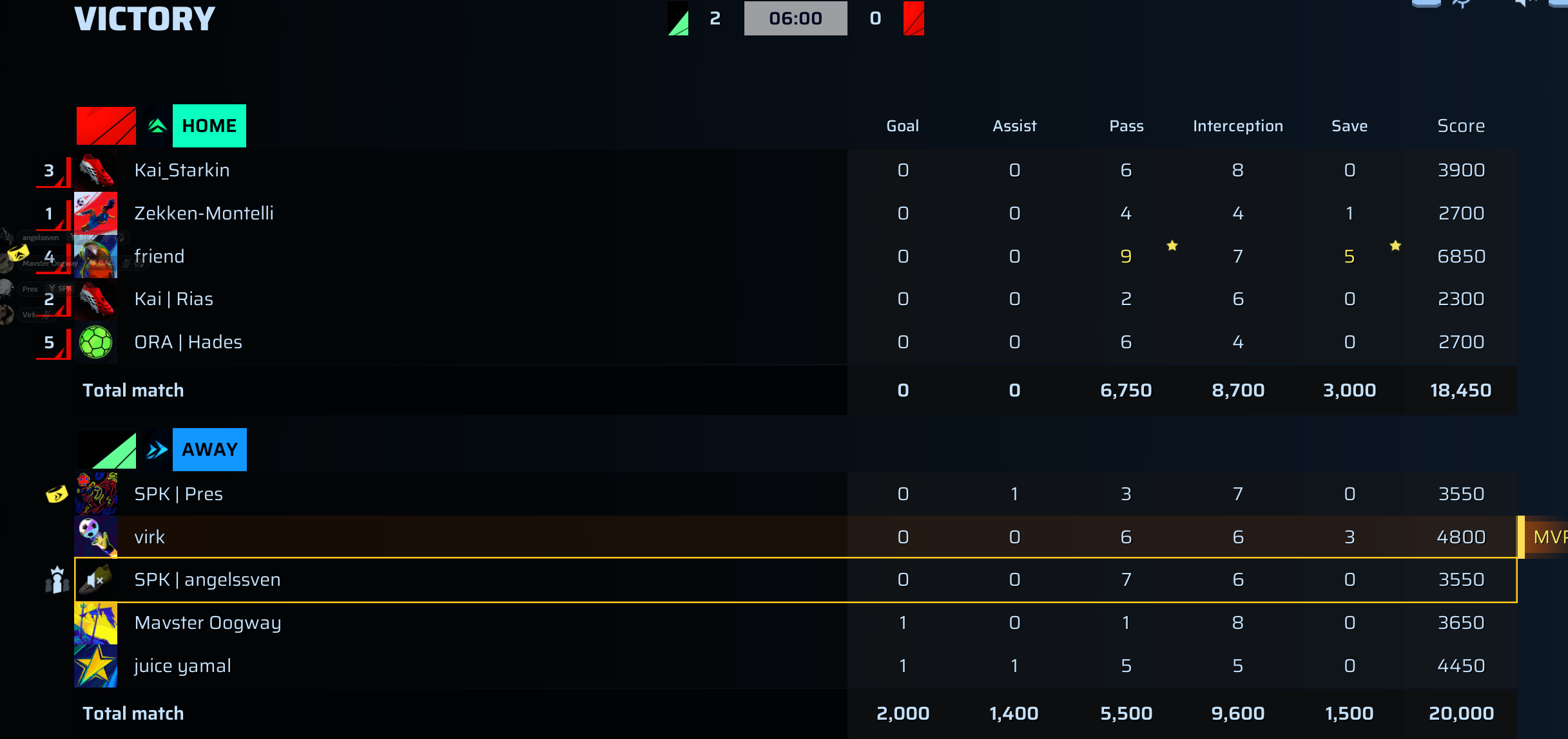 | Player | Goals | Assists | Passes | Interceptions | Saves | Score | Clean Sheet |