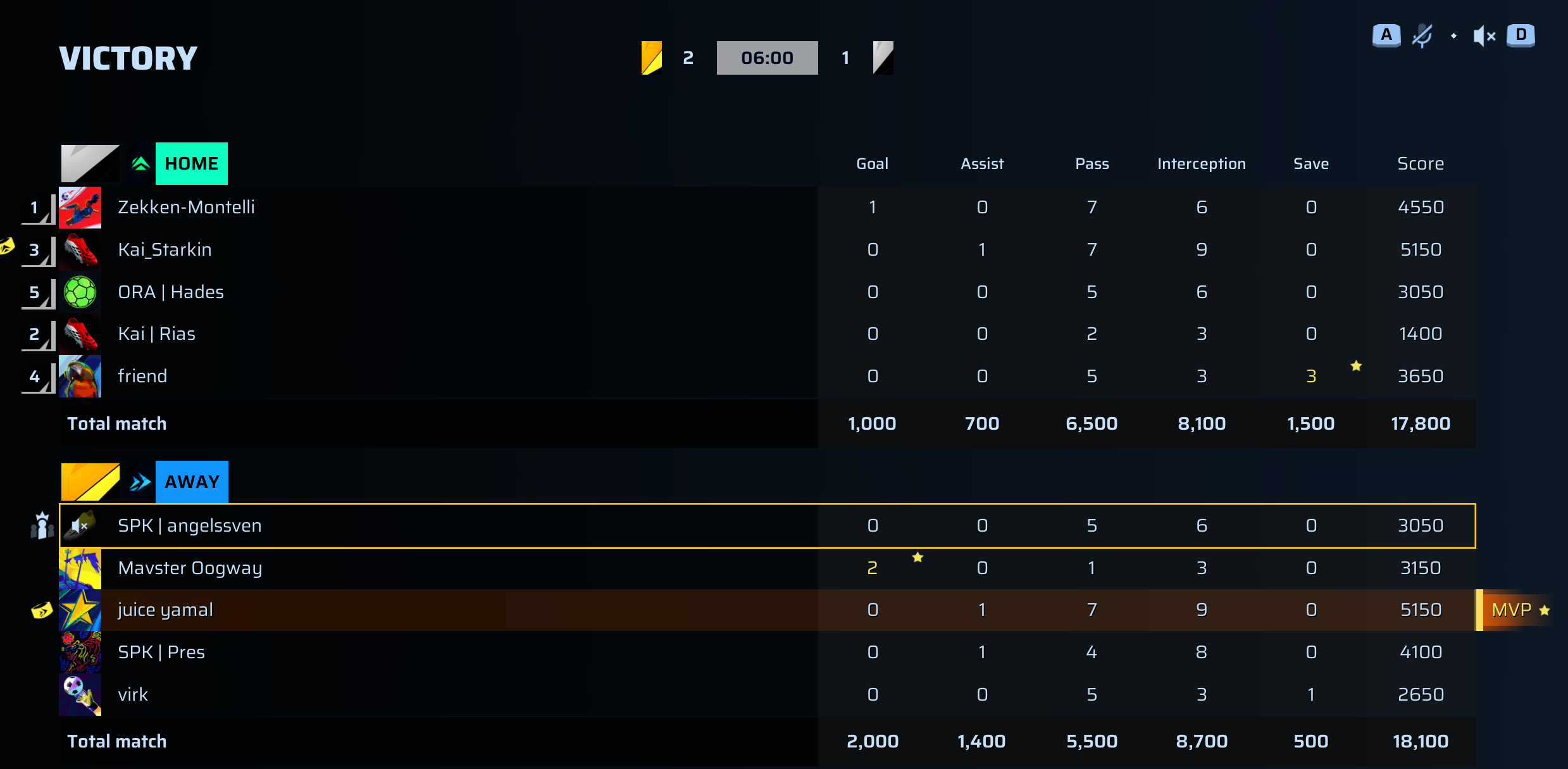 | Player | Goals | Assists | Passes | Interceptions | Saves | Score | Clean Sheet |