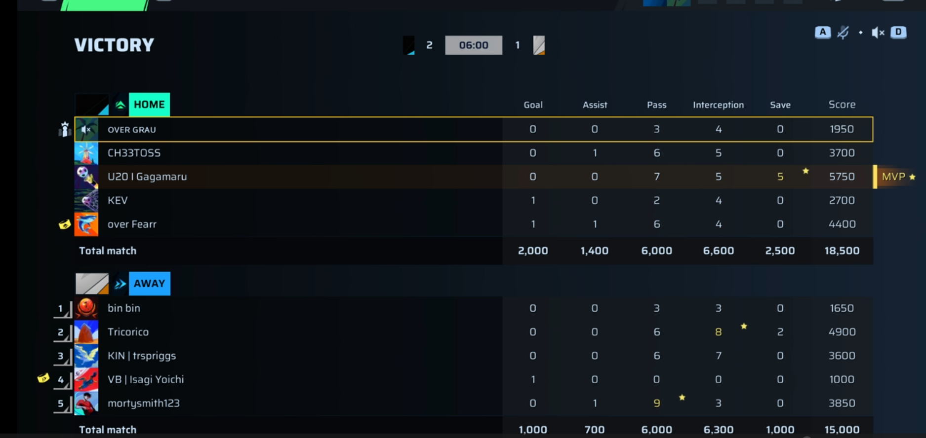 | Player | Goals | Assists | Passes | Interceptions | Saves | Score | Clean Sheet |