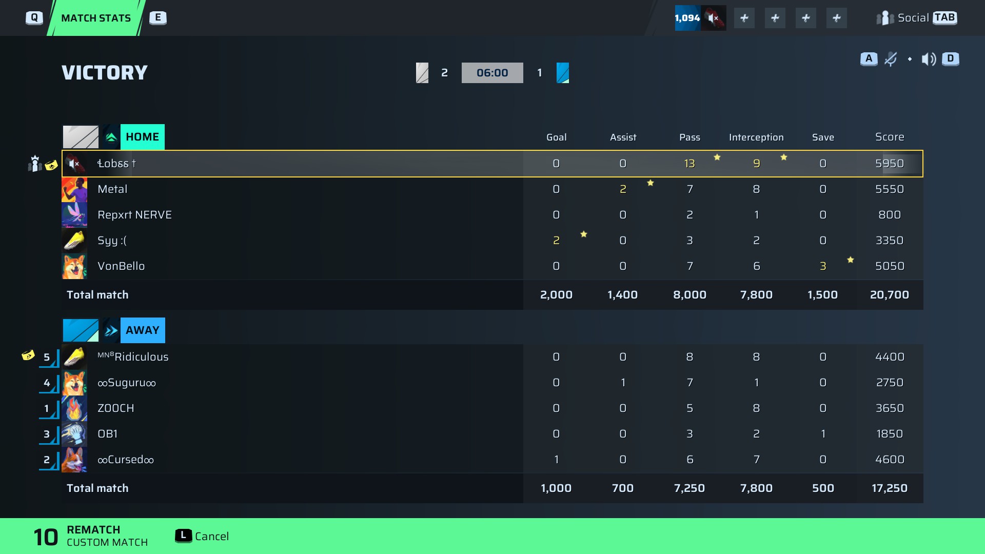 | Player | Goals | Assists | Passes | Interceptions | Saves | Score | Clean Sheet |