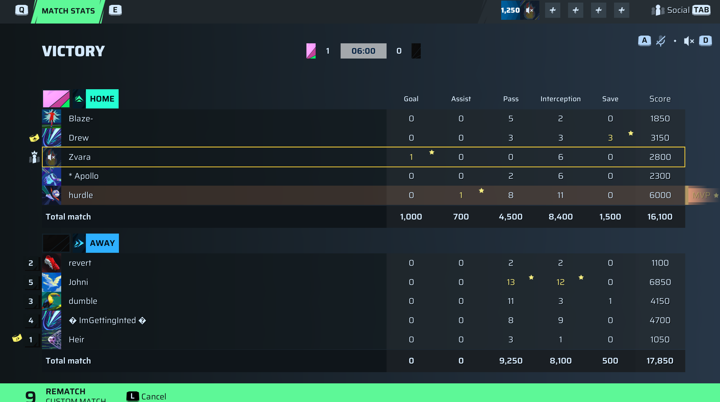 Zvara🐐#64 Striker94 OVR | 1 | 0 | 0 | 6 | 0 | 2,800 | — |