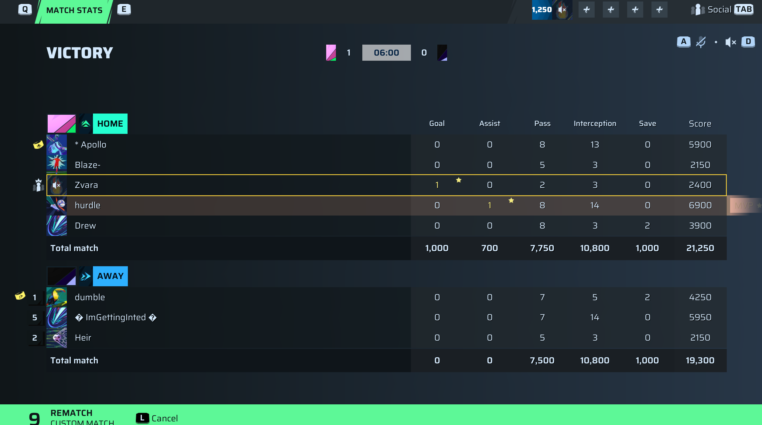 | Player | Goals | Assists | Passes | Interceptions | Saves | Score | Clean Sheet |
