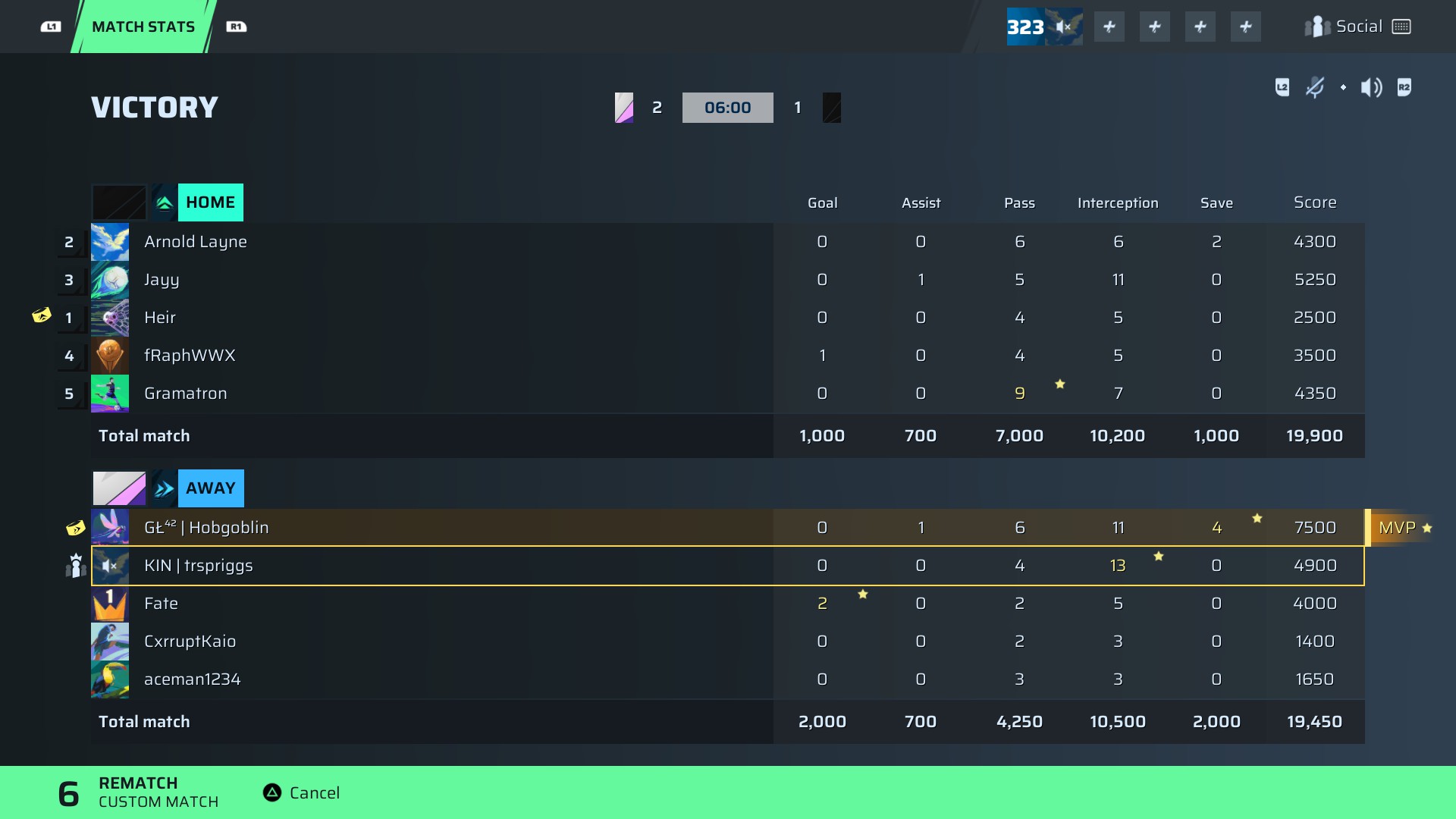 | Player | Goals | Assists | Passes | Interceptions | Saves | Score | Clean Sheet |
