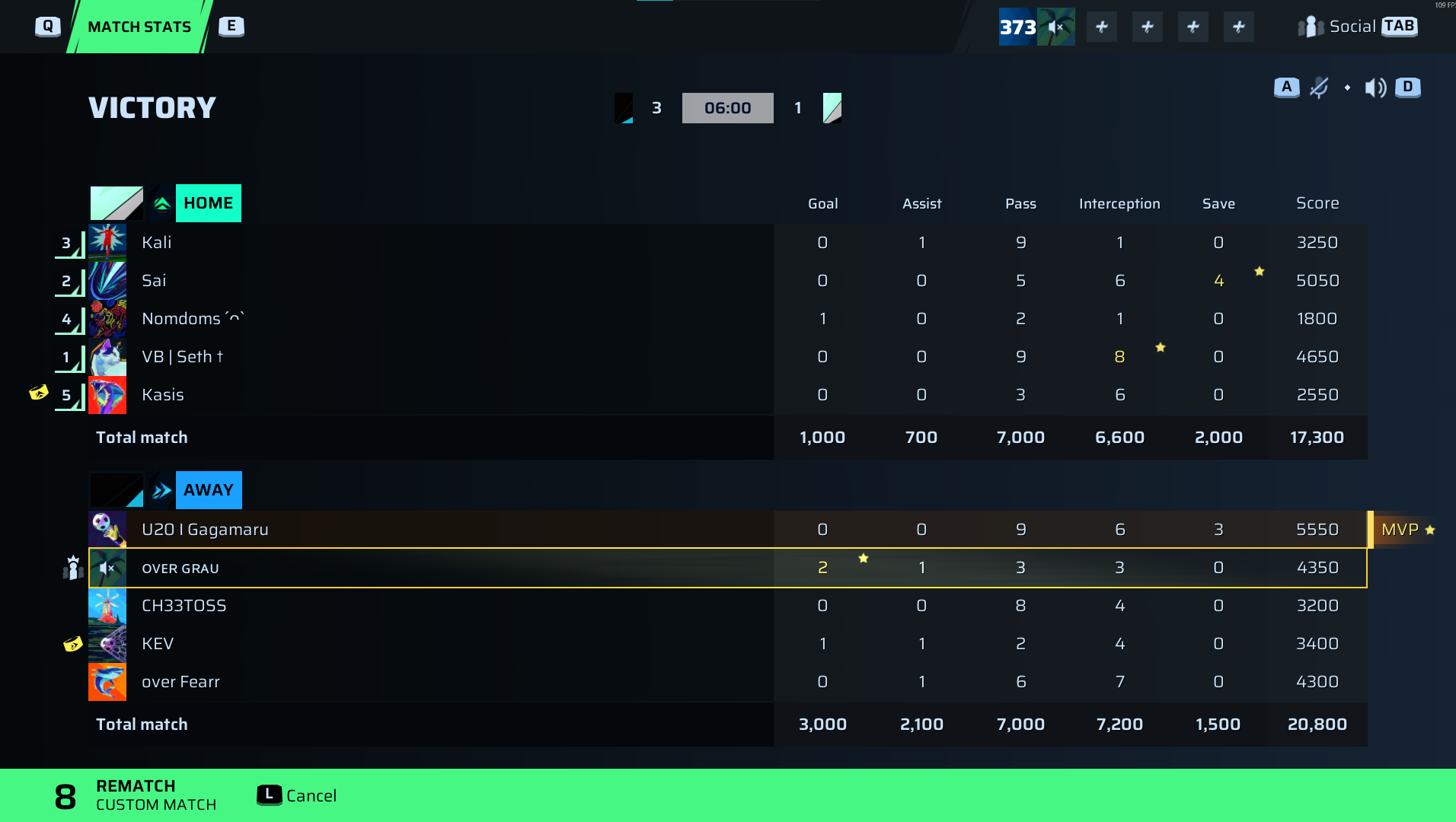 | Player | Goals | Assists | Passes | Interceptions | Saves | Score | Clean Sheet |