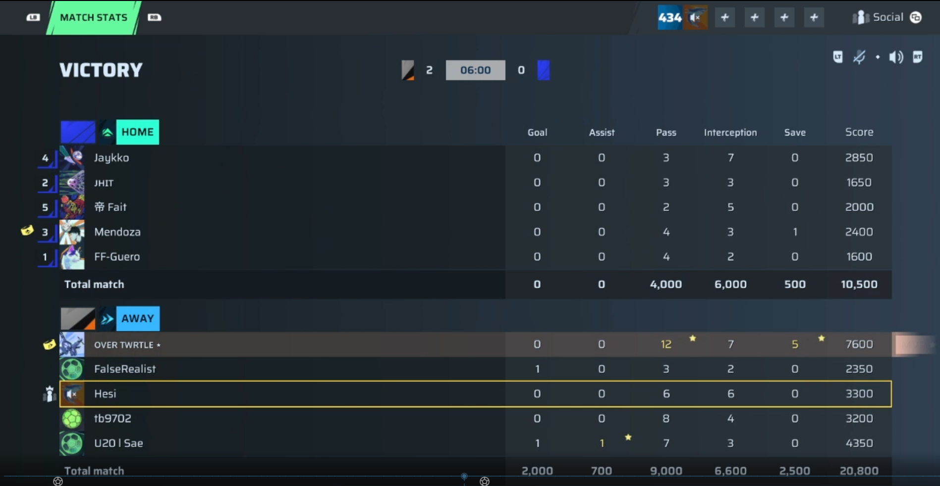 | Player | Goals | Assists | Passes | Interceptions | Saves | Score | Clean Sheet |