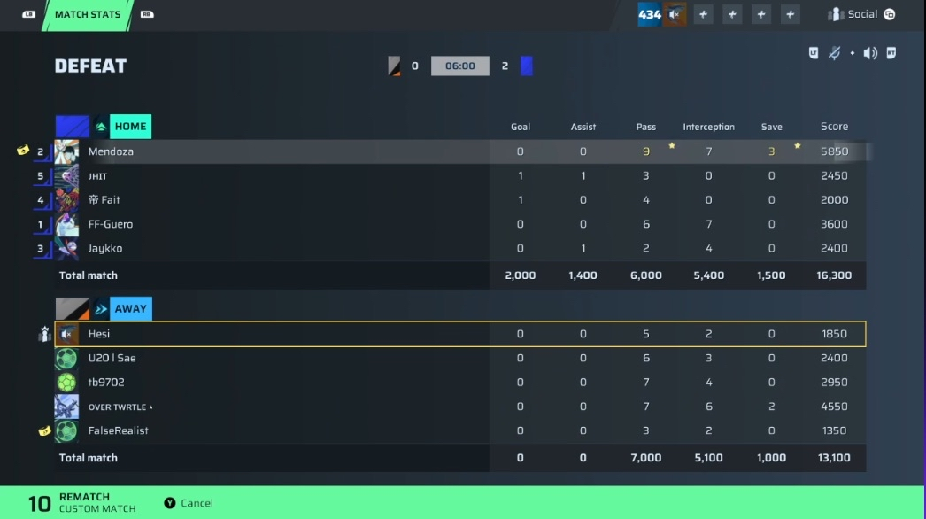 | Player | Goals | Assists | Passes | Interceptions | Saves | Score | Clean Sheet |