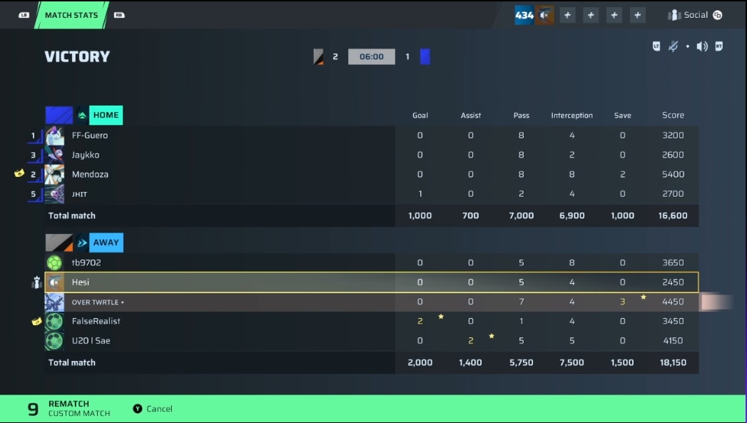 | Player | Goals | Assists | Passes | Interceptions | Saves | Score | Clean Sheet |