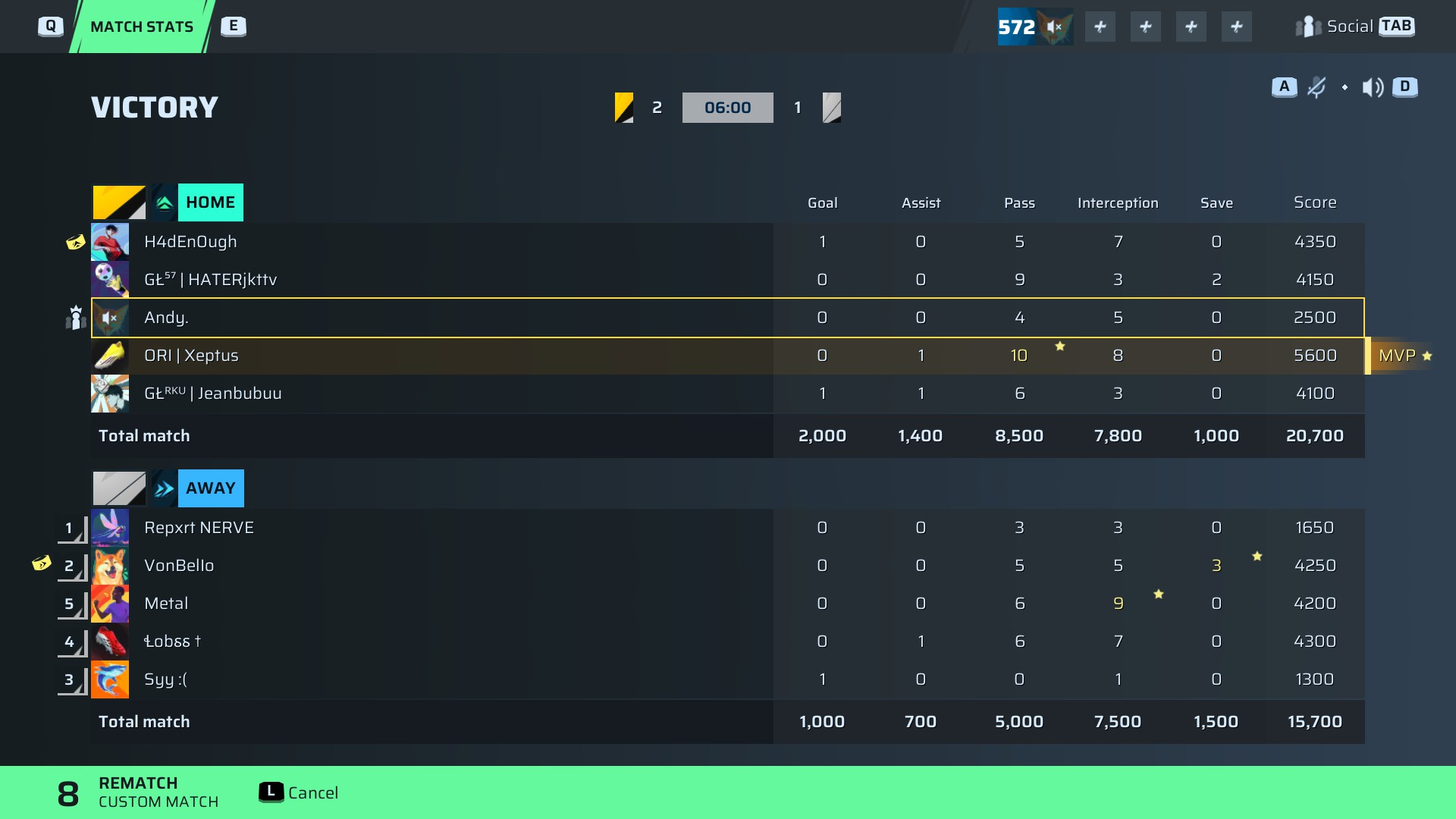 | Player | Goals | Assists | Passes | Interceptions | Saves | Score | Clean Sheet |