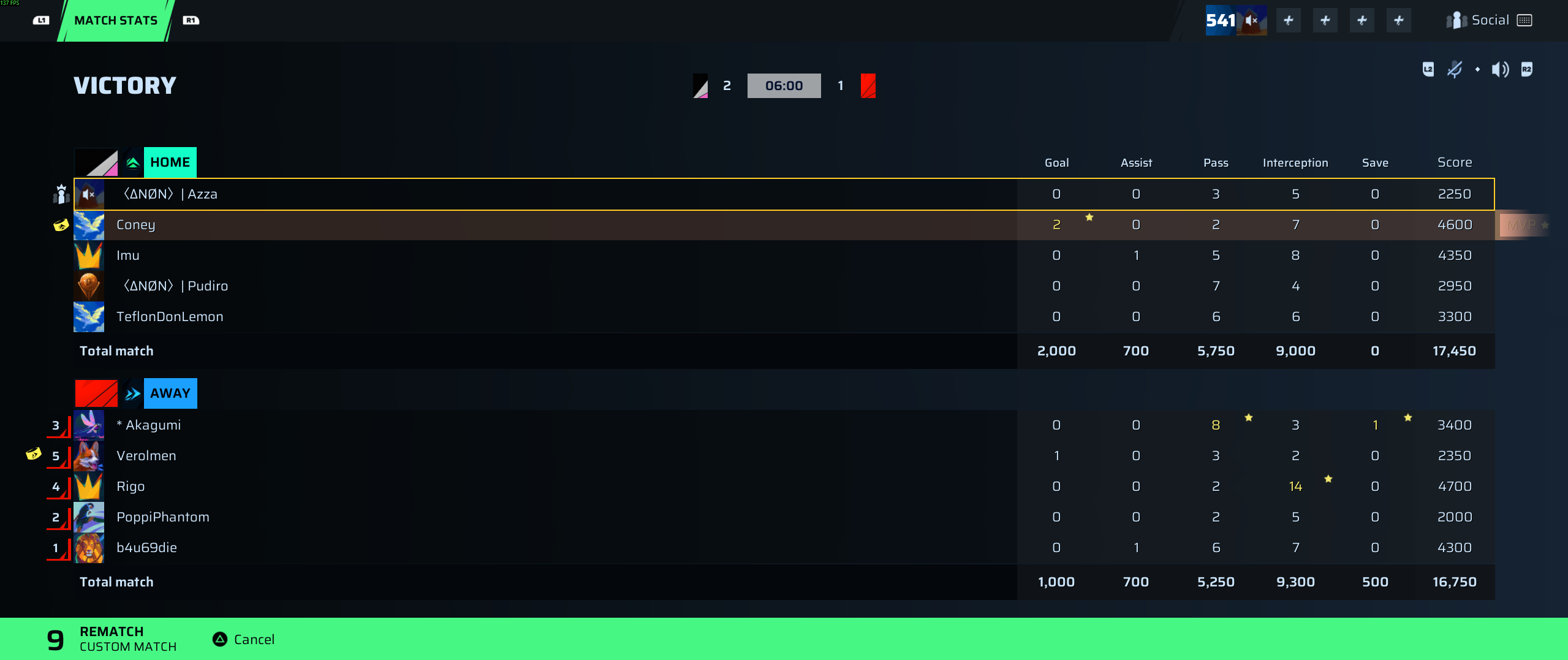 | Player | Goals | Assists | Passes | Interceptions | Saves | Score | Clean Sheet |