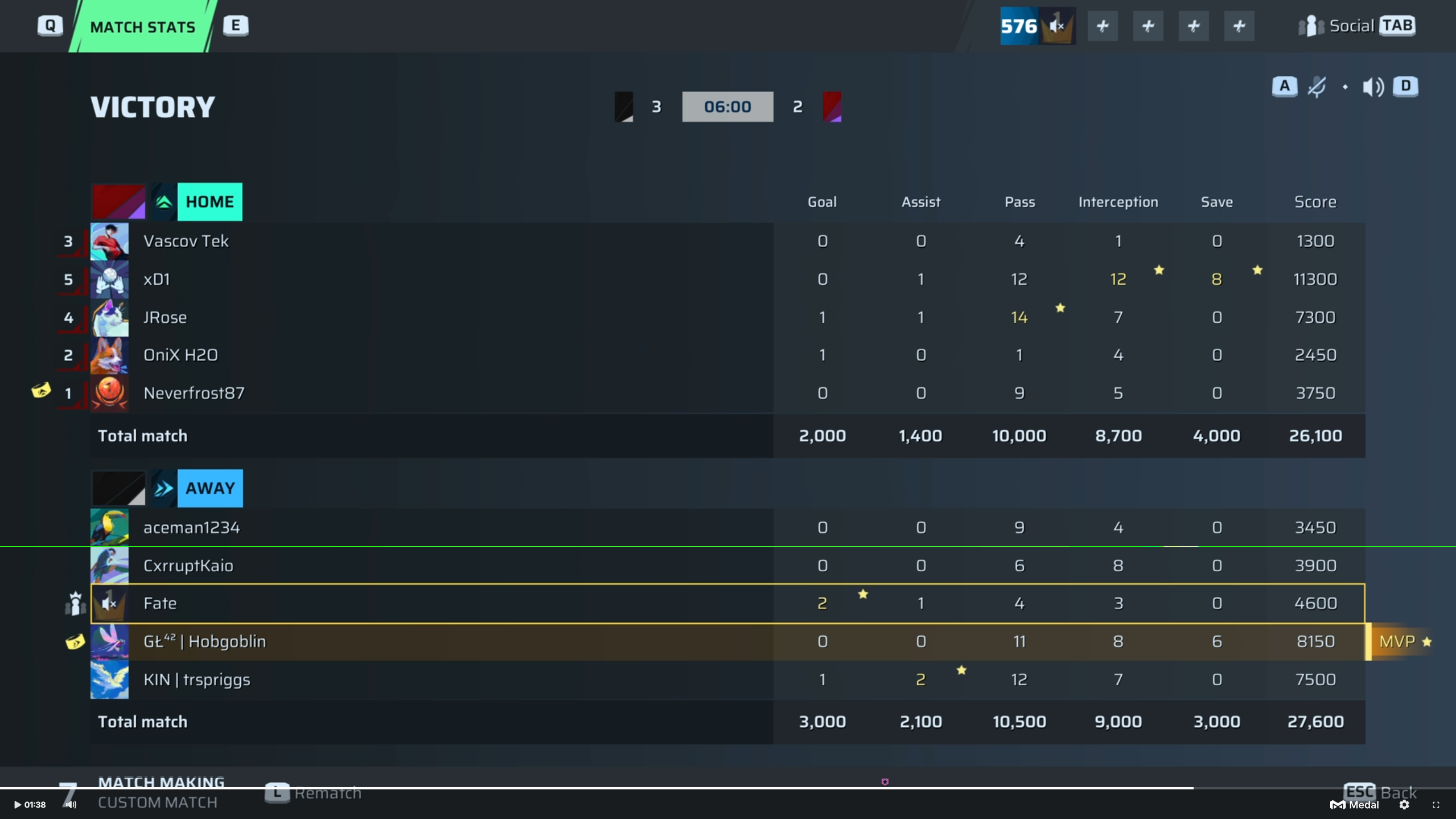 | Player | Goals | Assists | Passes | Interceptions | Saves | Score | Clean Sheet |