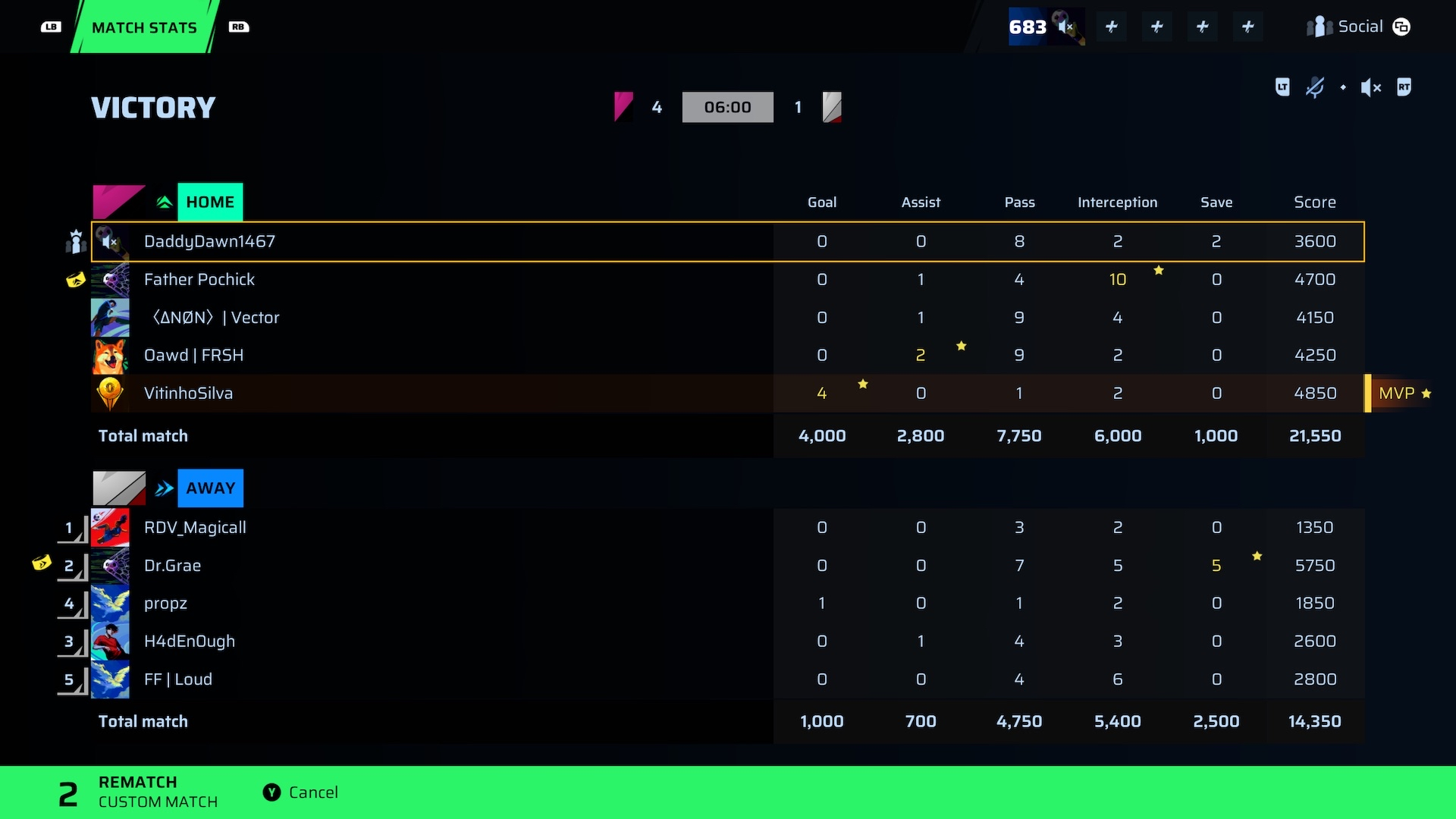 VitinhoSilva🐐#86 Striker⭐ MVP89 OVR | 4 | 0 | 1 | 2 | 0 | 4,850 | — |
