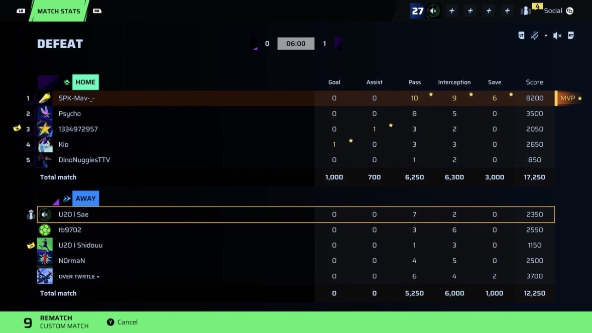 | Player | Goals | Assists | Passes | Interceptions | Saves | Score | Clean Sheet |