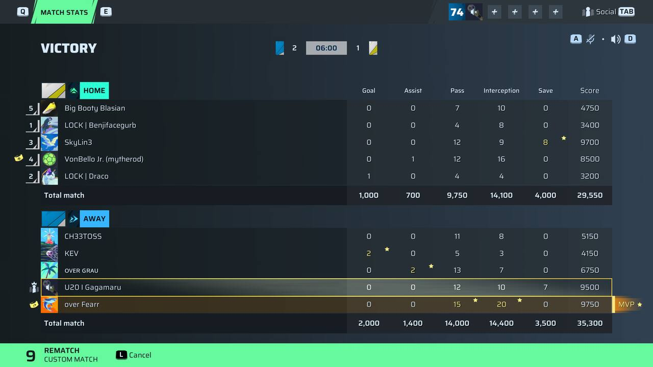 | Player | Goals | Assists | Passes | Interceptions | Saves | Score | Clean Sheet |