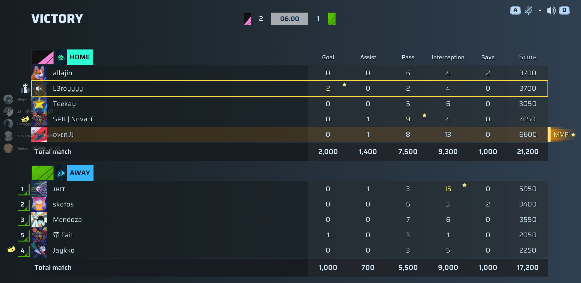 | Player | Goals | Assists | Passes | Interceptions | Saves | Score | Clean Sheet |
