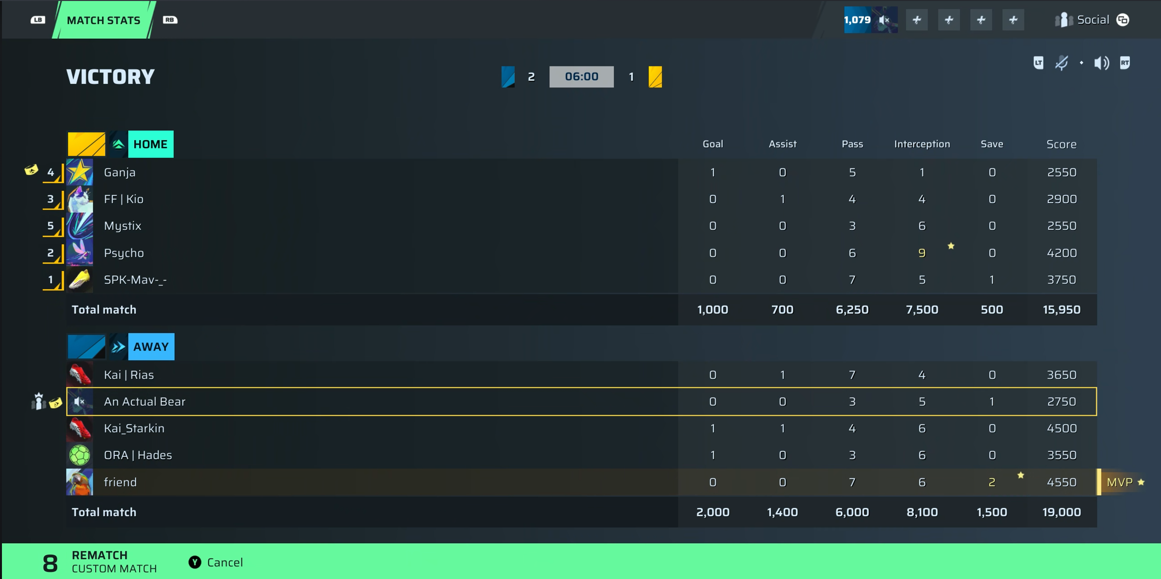 | Player | Goals | Assists | Passes | Interceptions | Saves | Score | Clean Sheet |