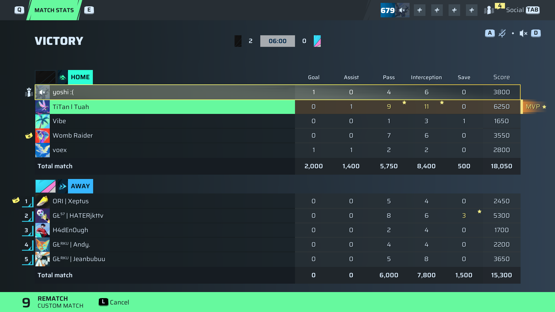 TiTan l Tuah🐐#67 Defense⭐ MVP92 OVR | 0 | 1 | 9 | 11 | 0 | 6,250 | — |