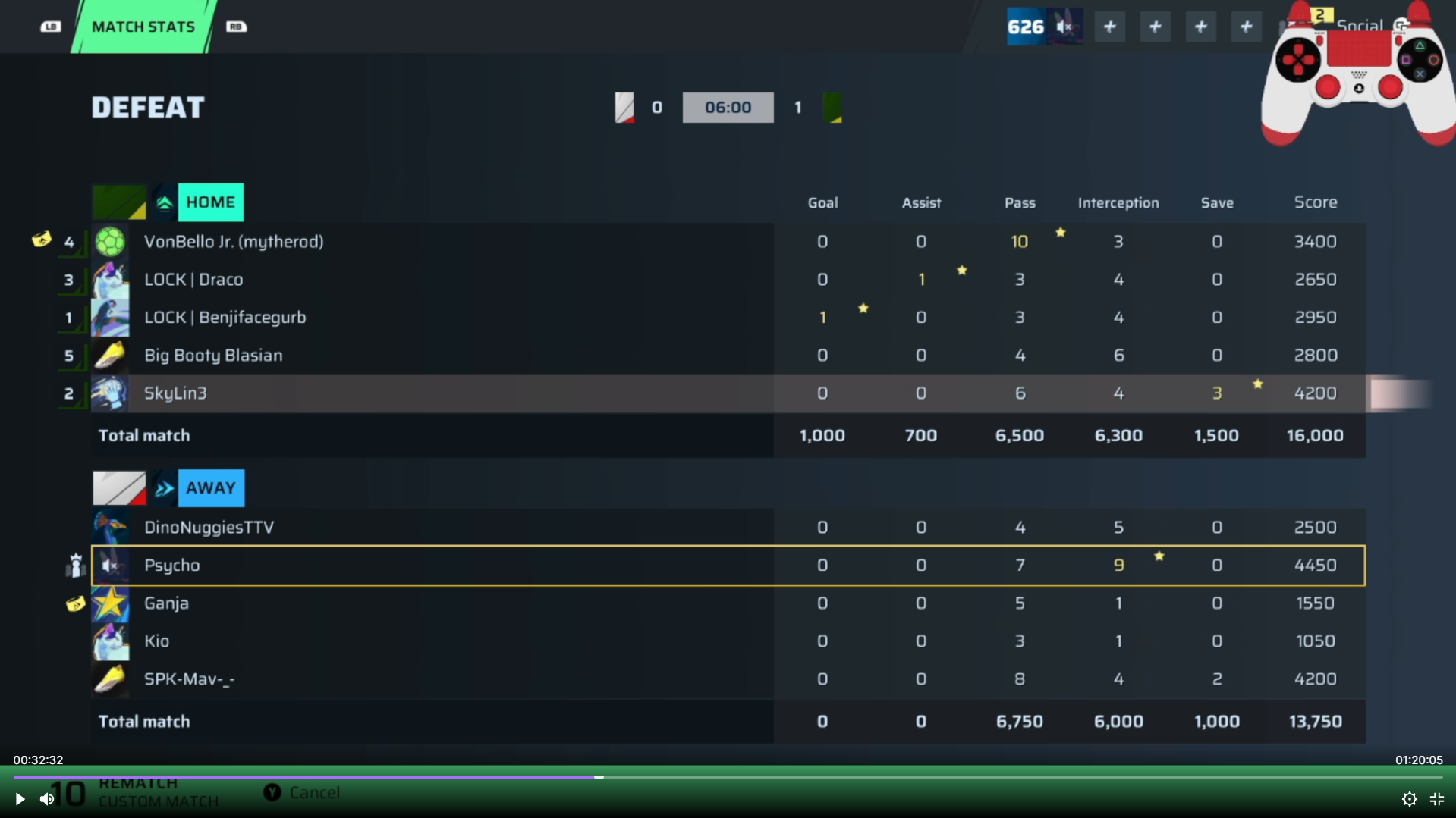| Player | Goals | Assists | Passes | Interceptions | Saves | Score | Clean Sheet |