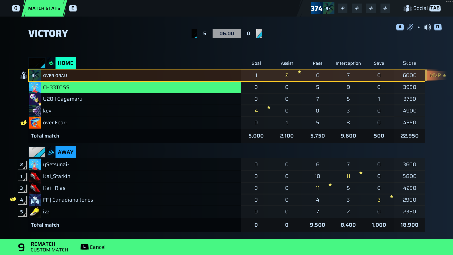 | Player | Goals | Assists | Passes | Interceptions | Saves | Score | Clean Sheet |
