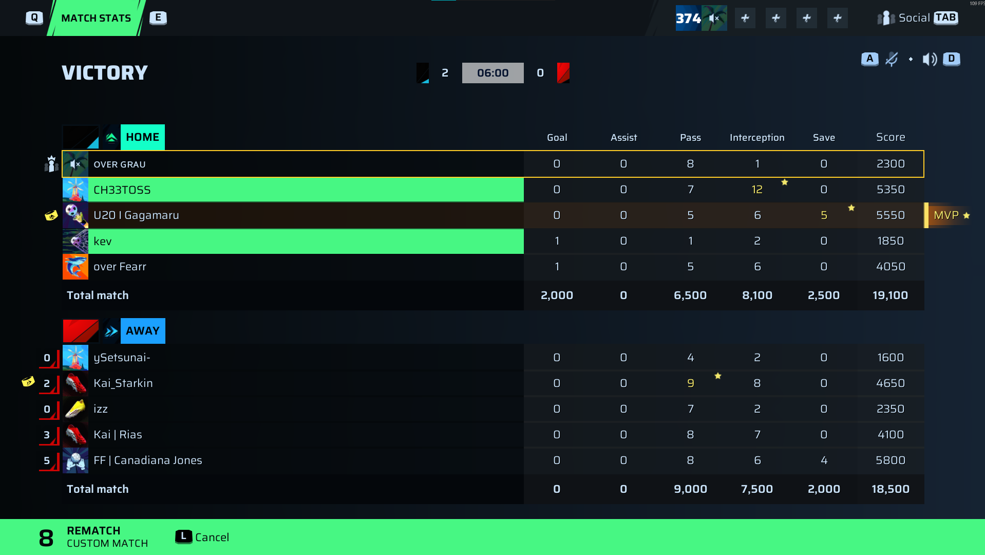 | Player | Goals | Assists | Passes | Interceptions | Saves | Score | Clean Sheet |