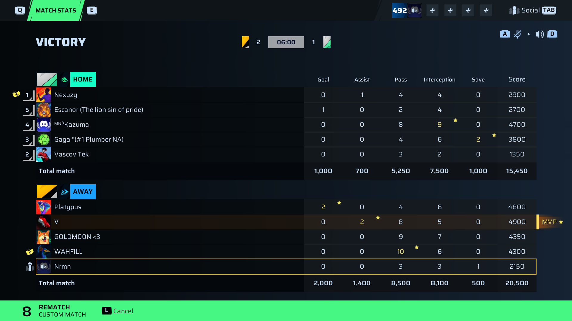 | Player | Goals | Assists | Passes | Interceptions | Saves | Score | Clean Sheet |