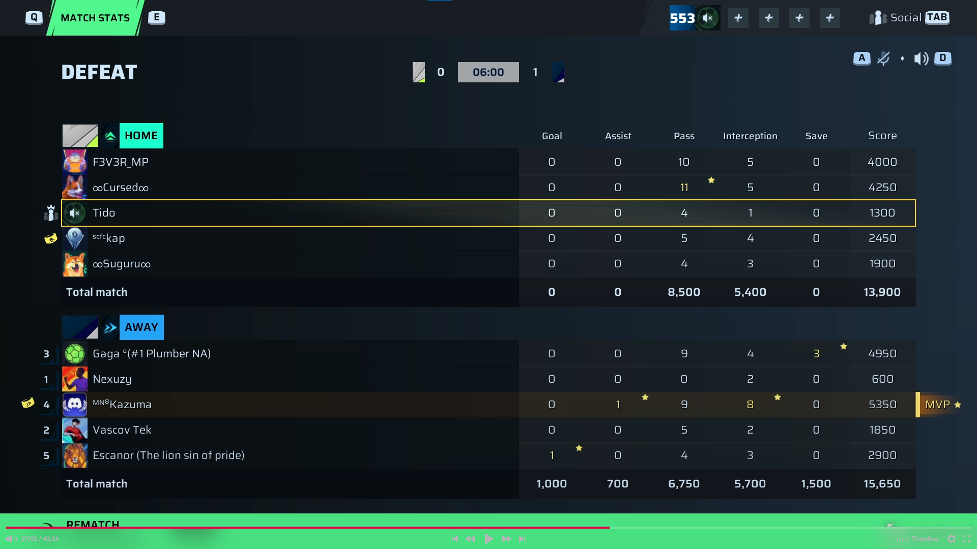 | Player | Goals | Assists | Passes | Interceptions | Saves | Score | Clean Sheet |