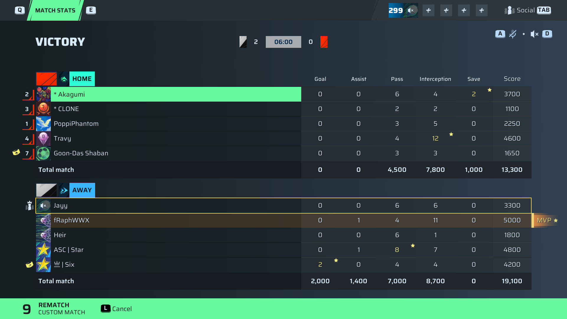 | Player | Goals | Assists | Passes | Interceptions | Saves | Score | Clean Sheet |