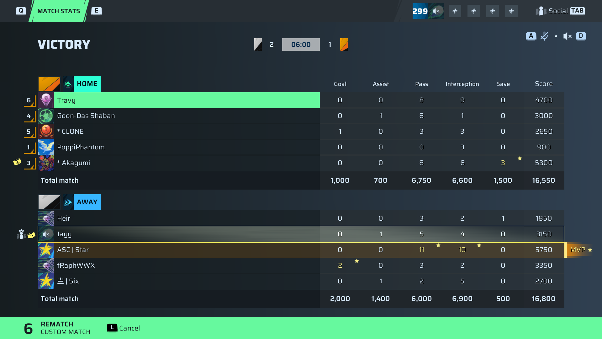 | Player | Goals | Assists | Passes | Interceptions | Saves | Score | Clean Sheet |