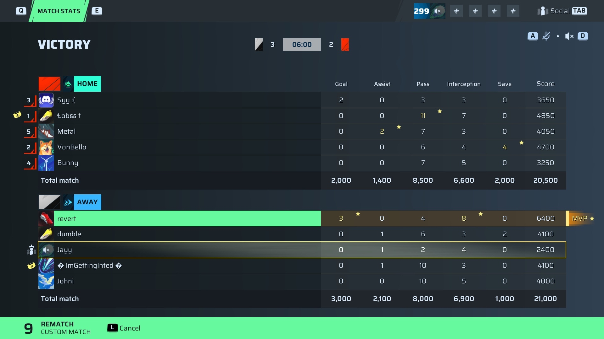 | Player | Goals | Assists | Passes | Interceptions | Saves | Score | Clean Sheet |