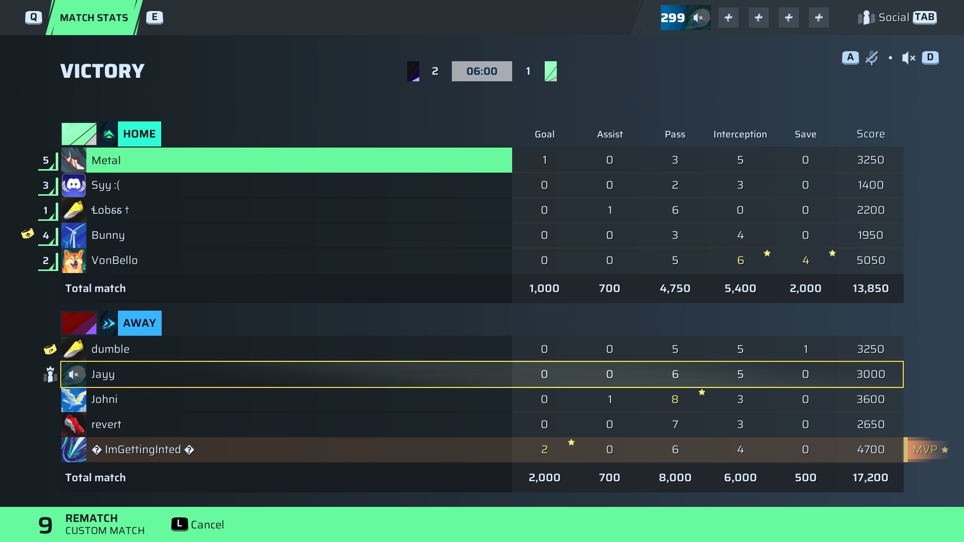 | Player | Goals | Assists | Passes | Interceptions | Saves | Score | Clean Sheet |