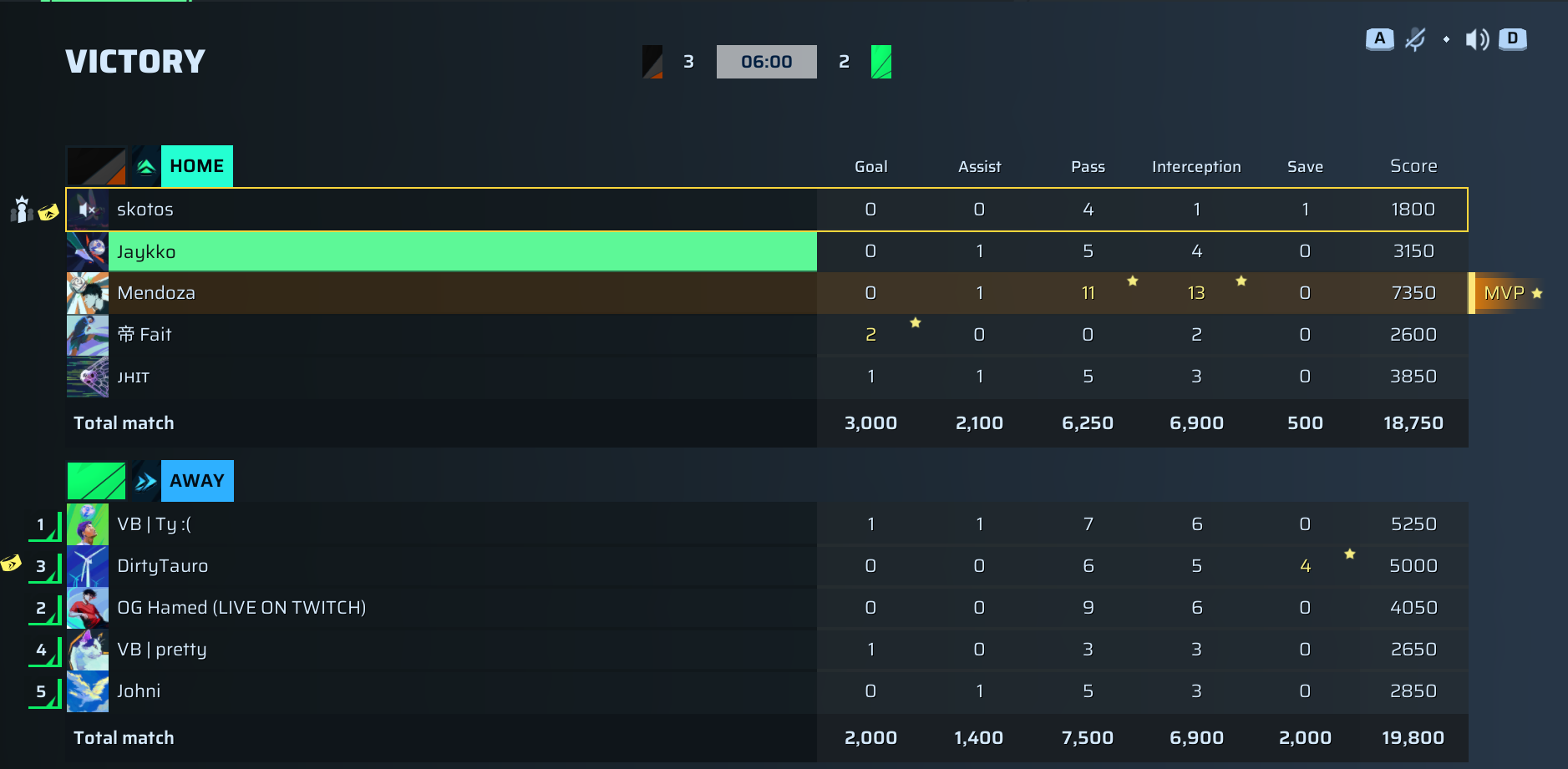 | Player | Goals | Assists | Passes | Interceptions | Saves | Score | Clean Sheet |
