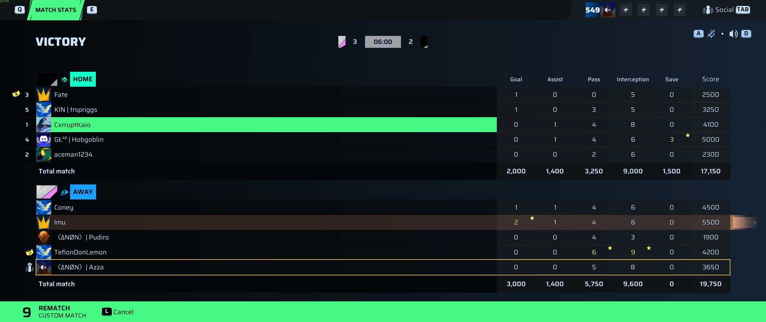 | Player | Goals | Assists | Passes | Interceptions | Saves | Score | Clean Sheet |
