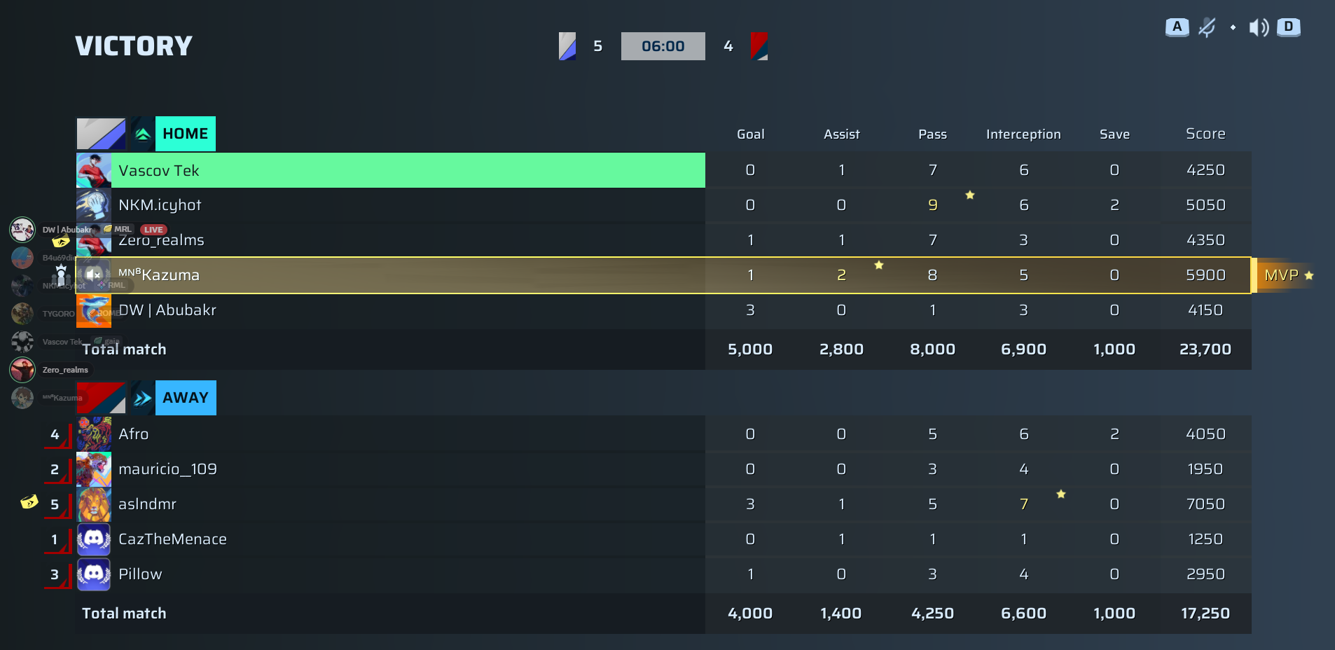 | Player | Goals | Assists | Passes | Interceptions | Saves | Score | Clean Sheet |