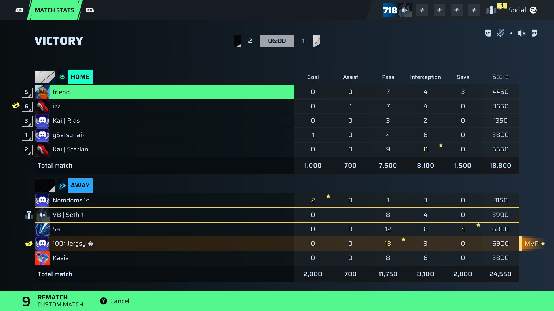 | Player | Goals | Assists | Passes | Interceptions | Saves | Score | Clean Sheet |
